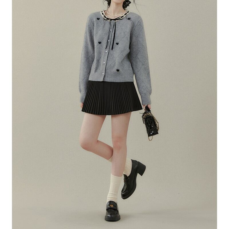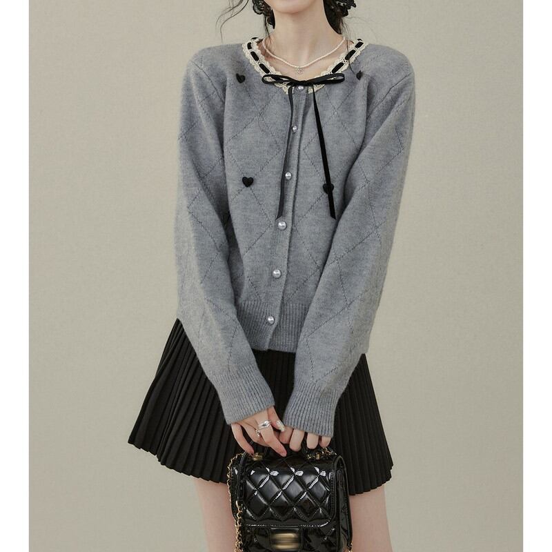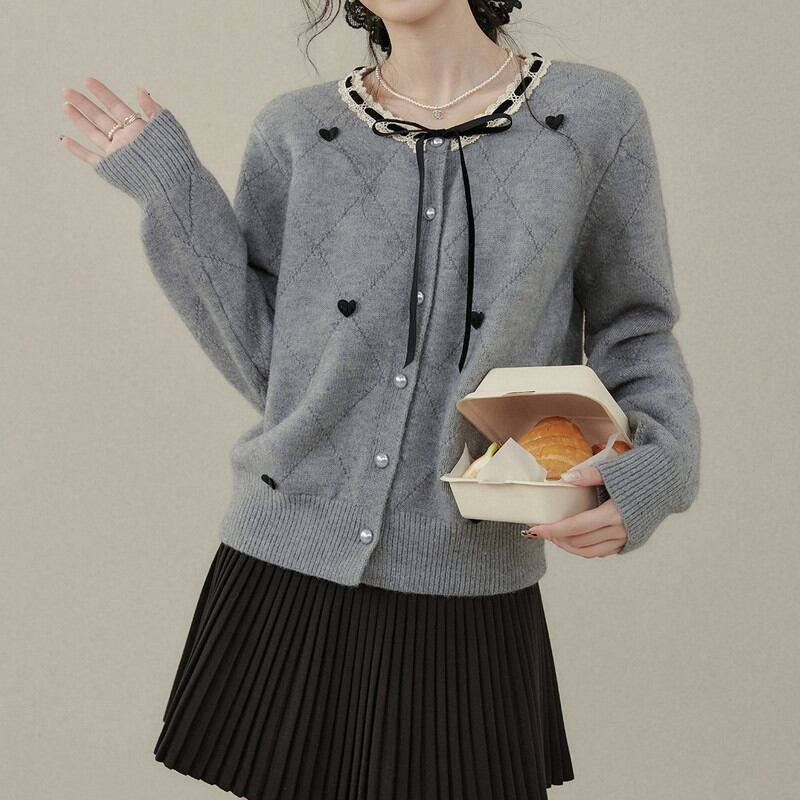 襟元に繊細なレースと華奢なリボンをあしらい、クラシカルな甘さを添えたカーディガンです。 全体に散りばめられた小さなハートのモチーフが、遊び心のある大人可愛いアクセントを演出。 ダイヤ型の編み模様と艶やかなパールボタンが、上品で洗練された佇まいを際立たせます。 程よい丈感でボトムスを選ばず、日々のコーディネートにロマンティックな彩りを与える一着です。 ◼️サイズ 【S】 肩幅:39cm 胸囲:104cm 着丈:51cm 袖丈:60cm 【M】 肩幅:40cm 胸囲:108cm 着丈:52cm 袖丈:61cm 【L】 肩幅:41cm 胸囲:112cm 着丈:53cm 袖丈:62cm 【XL】 肩幅:42cm 胸囲:116cm 着丈:54cm 袖丈:63cm ◼️カラー グレー ◼️素材 ポリエステル33% アクリル45% ナイロン22% 【お届けについて】 こちらの商品は海外店舗より直接発送となる為、ご入金から1〜3週間でお届けいたします。 ◼️注意事項 ・タイミングによっては 商品在庫切れにより注文キャンセルとさせていただく恐れもございますので、予めご了承くださいませ。 ・日本製とは検品基準が異なる為、縫製などが若干甘い場合があります。 ・海外倉庫にて保管をしております。在庫情報に時差が生じますため在庫切れや生産中止、生産に遅れがある場合は、受注後でもキャンセルさせていただく恐れがございます。 ・商品の色味は、お手持ちのスマートフォンの画面によって実物と若干異なる場合がございます。 ・発送時期によりデザイン仕様(細部、素材など)の変更がある場合がございます。 ・イメージ違いやサイズ交換等、お客さまご都合による交換、返品は対応出来かねます。 ———————————— 誠に恐れ入りますが、ご購入前に以下をご確認頂きご承諾の上お買い求めくださいませ。 →https://petitelune.official.ec/about ————————————