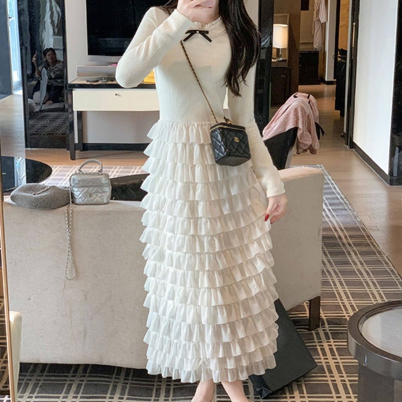 タイトなリブニットのトップスと、贅沢なボリュームのフリルスカートを組み合わせたドッキングワンピースです。