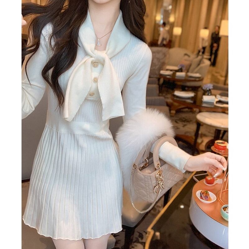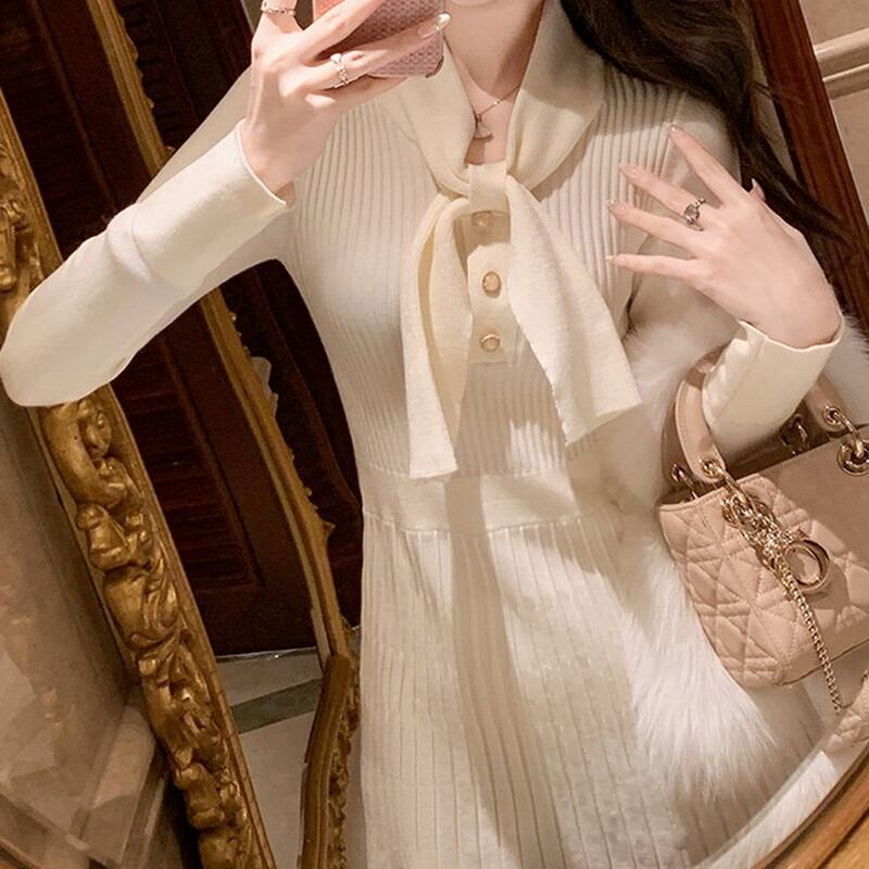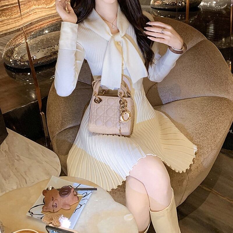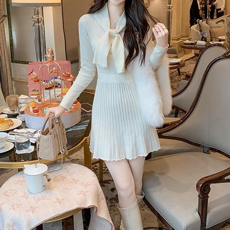 胸元の大きなボウタイデザインが、お顔周りを清楚で知的な印象に彩るニットワンピースです。