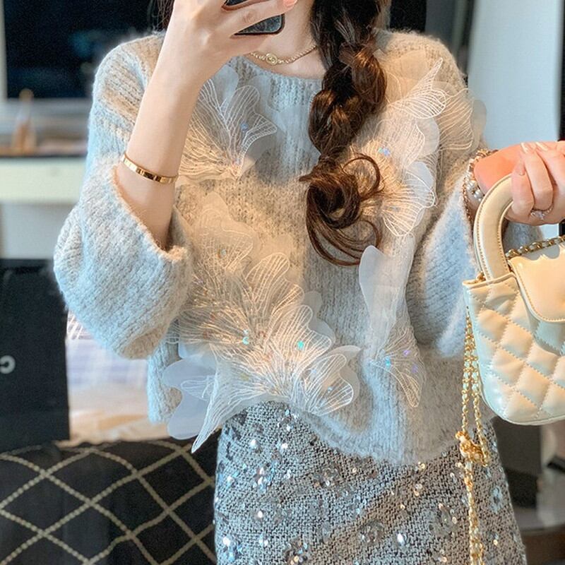 フロントに施された大ぶりの立体刺繍が、幻想的で華やかな表情を演出するニットです。