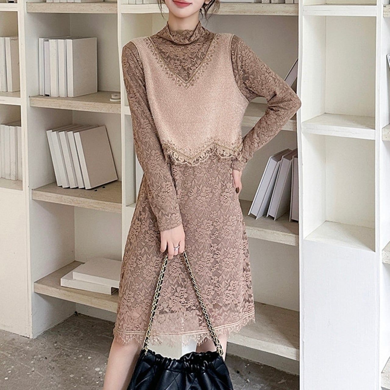 レースの透け感が、大人の女性らしさを演出する、ベスト付きのハイネックワンピース。 ミディ丈のワンピースは、上品で落ち着いた印象を与えます。 ノースリーブのベストを重ね着することで、いつもと違う雰囲気を楽しめます。 ◼️サイズ ワンピース 【S】 着丈:102cm 胸囲:80cm 【M】 着丈:103cm 胸囲:84cm 【L】 着丈:104cm 胸囲:88cm 【XL】 着丈:105cm 胸囲:92cm ベスト 【S】 着丈:39cm 胸囲:82cm 【M】 着丈:40cm 胸囲:86cm 【L】 着丈:41cm 胸囲:90cm 【XL】 着丈:42cm 胸囲:94cm ※採寸方法により1~3cmの誤差がある場合がございます ◼️カラー ベージュ ブラック 【お届けについて】 こちらの商品は海外店舗より直接発送となる為、ご入金から1〜3週間でお届けいたします。 ◼️注意事項 ・タイミングによっては 商品在庫切れにより注文キャンセルとさせていただく恐れもございますので、予めご了承くださいませ。 ・日本製とは検品基準が異なる為、縫製などが若干甘い場合があります。 ・海外倉庫にて保管をしております。在庫情報に時差が生じますため在庫切れや生産中止、生産に遅れがある場合は、受注後でもキャンセルさせていただく恐れがございます。 ・商品の色味は、お手持ちのスマートフォンの画面によって実物と若干異なる場合がございます。 ・発送時期によりデザイン仕様(細部、素材など)の変更がある場合がございます。 ・イメージ違いやサイズ交換等、お客さまご都合による交換、返品は対応出来かねます。 ———————————— 誠に恐れ入りますが、ご購入前に以下をご確認頂きご承諾の上お買い求めくださいませ。 →https://petitelune.official.ec/about ————————————