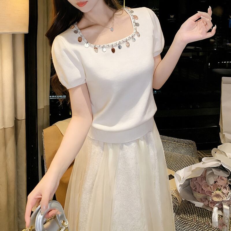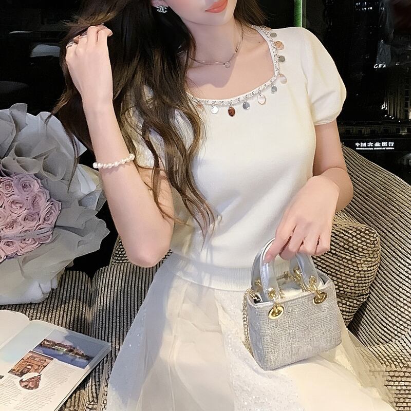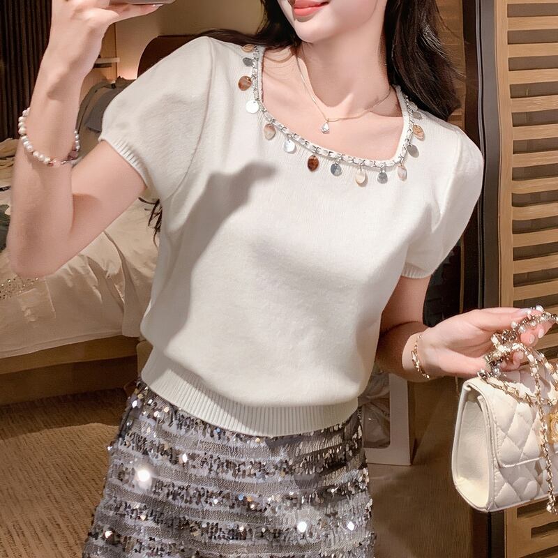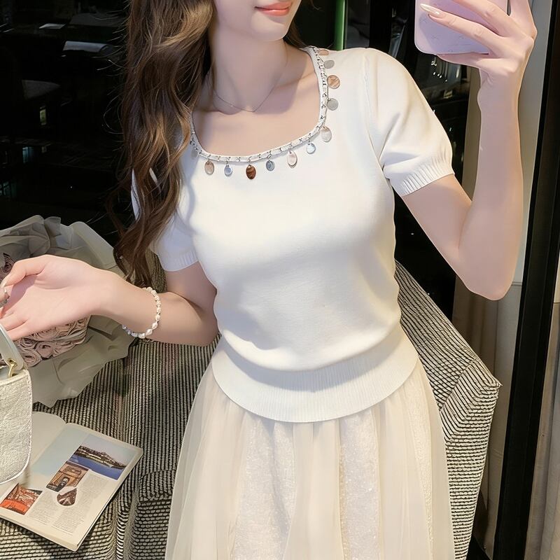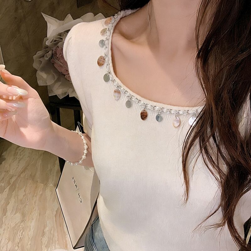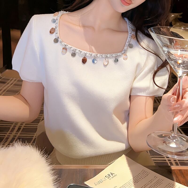 首元のメタルパーツがアクセントになり、顔周りを華やかに演出するニットトップス。