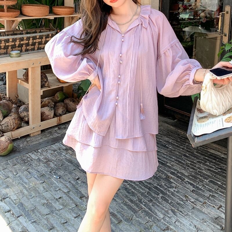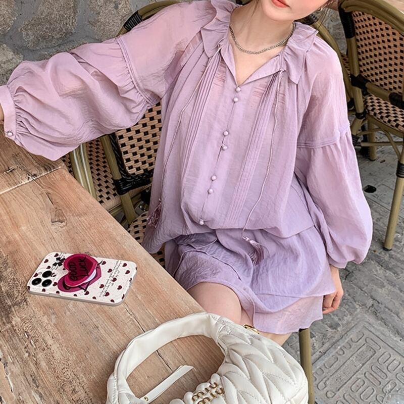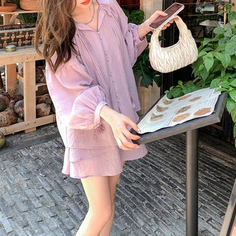 シフォンのとろみ感が可憐な印象のブラウスとミニスカートのセットアップ。