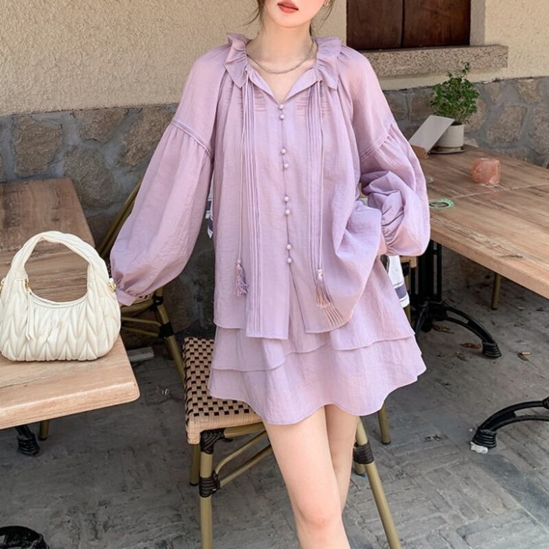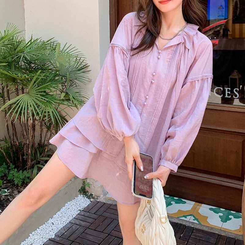 首元のフリルが顔周りを華やかに演出し、上品な雰囲気をプラスします。