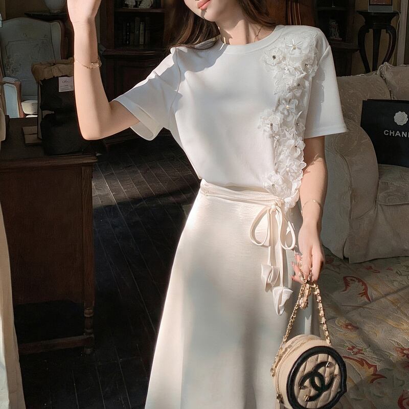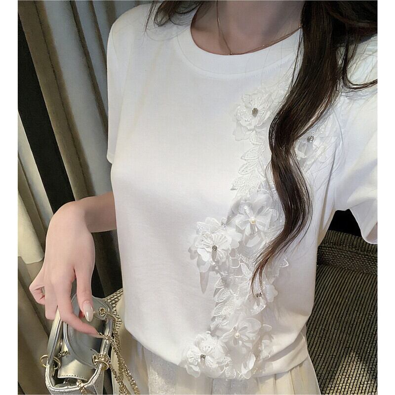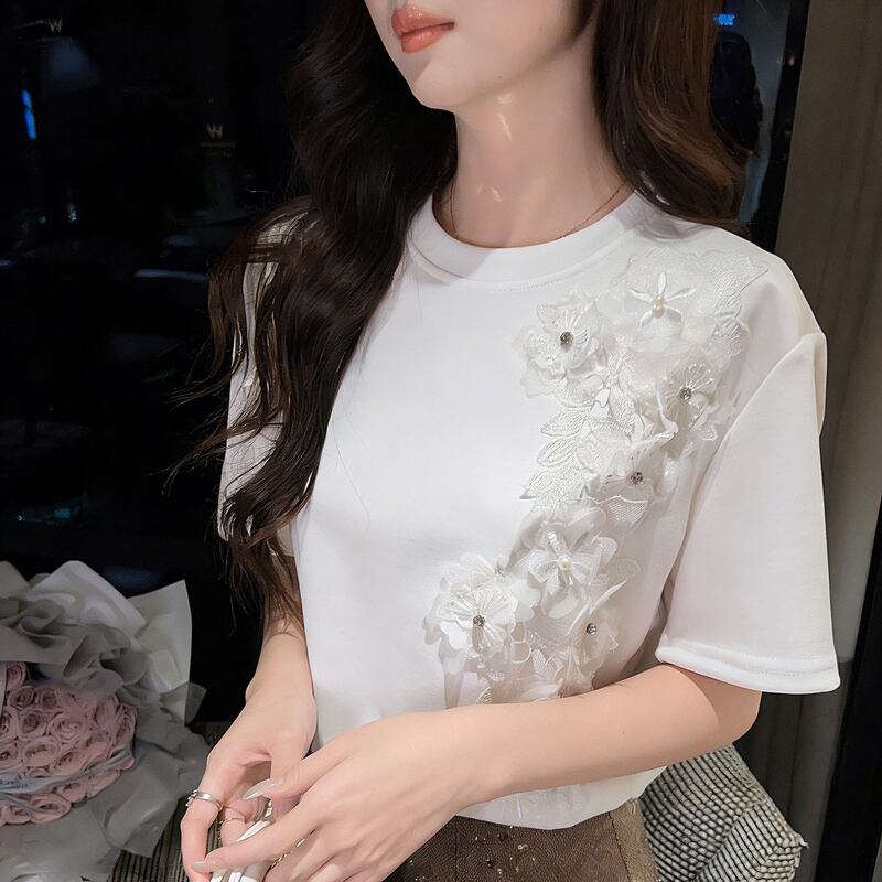 胸元の花柄モチーフが、フェミニンな印象をプラスする五分袖Tシャツ。