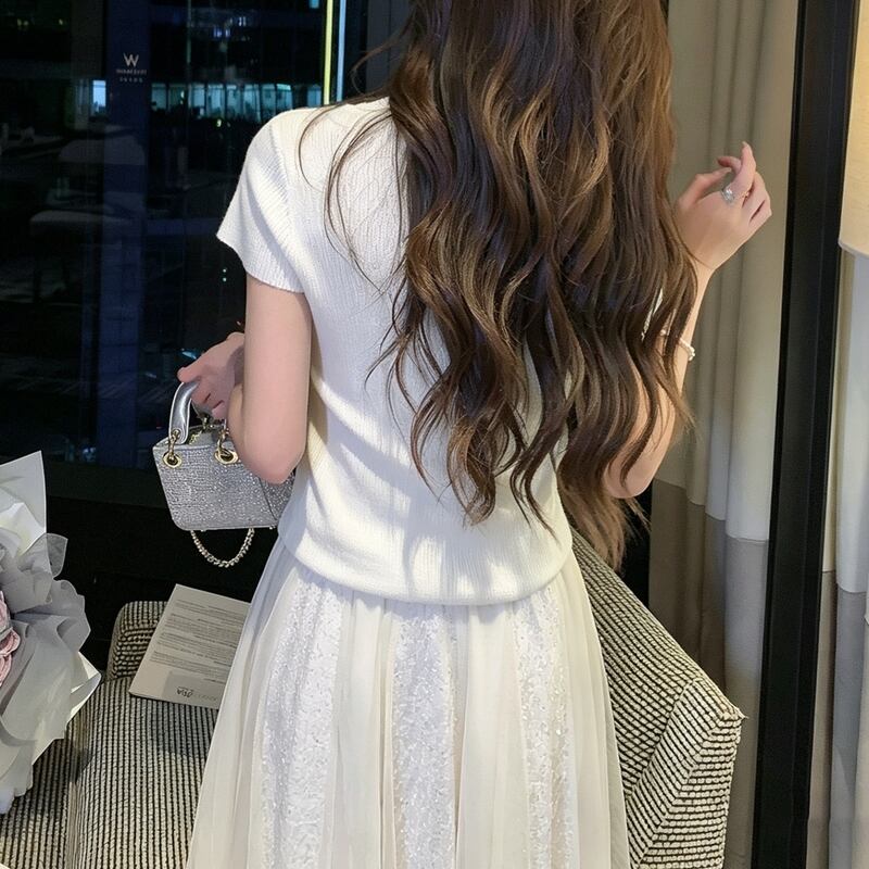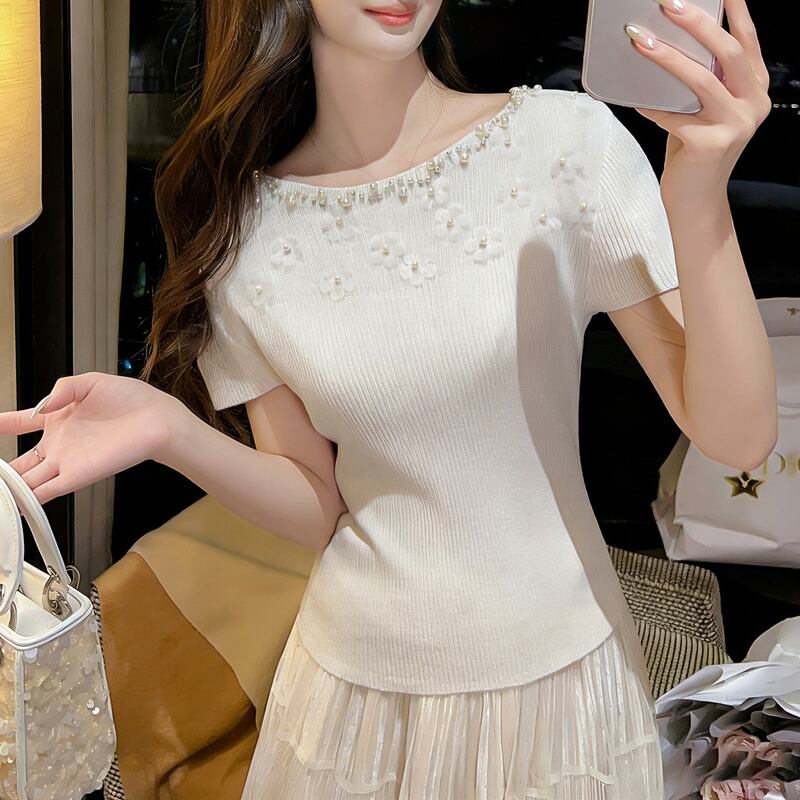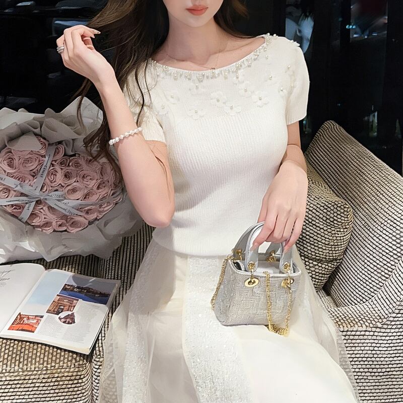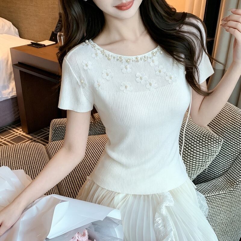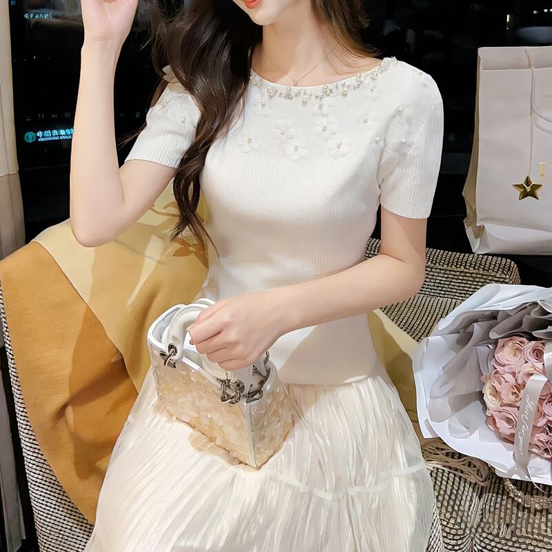 パール&フラワーモチーフ半袖ニット 00482