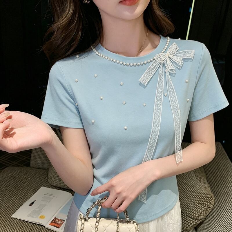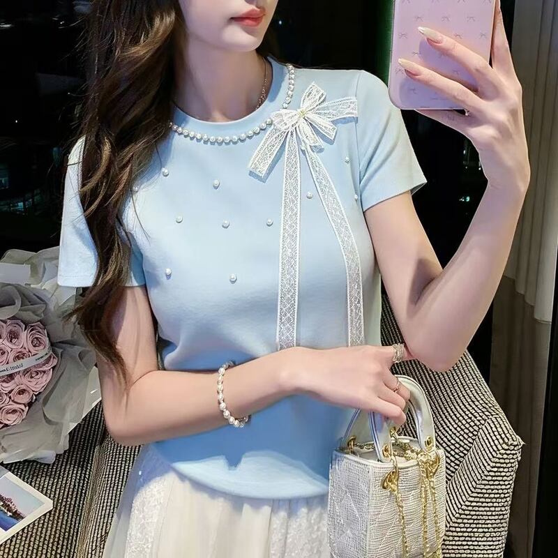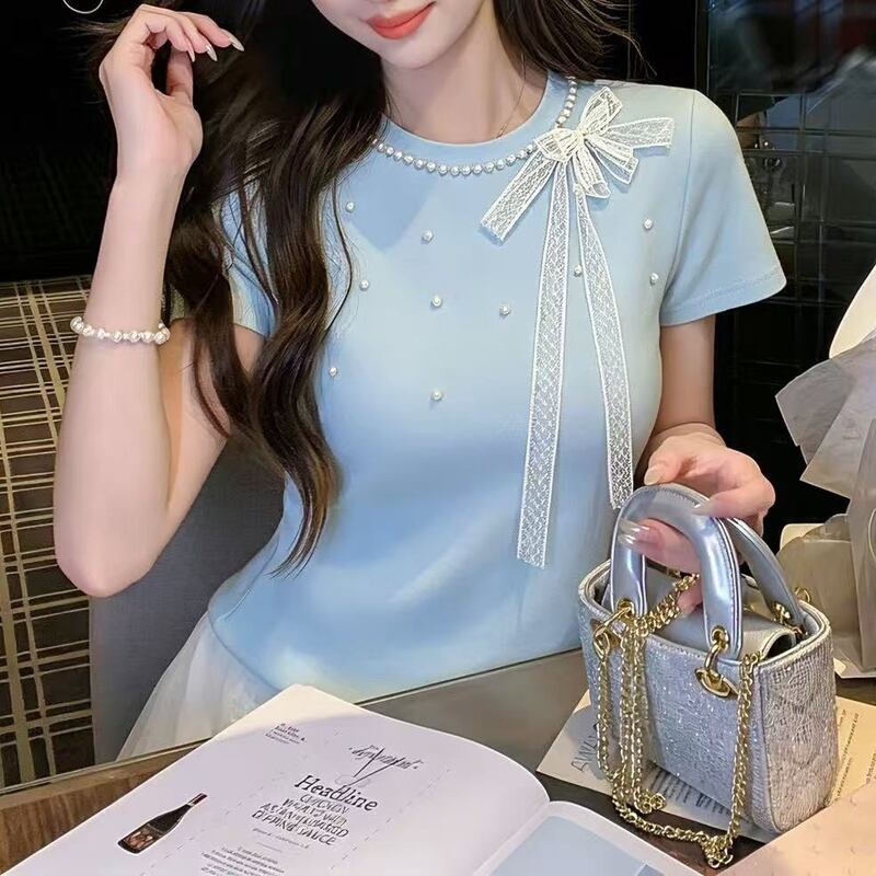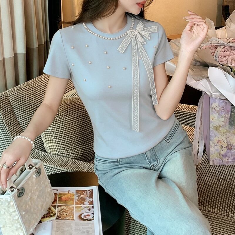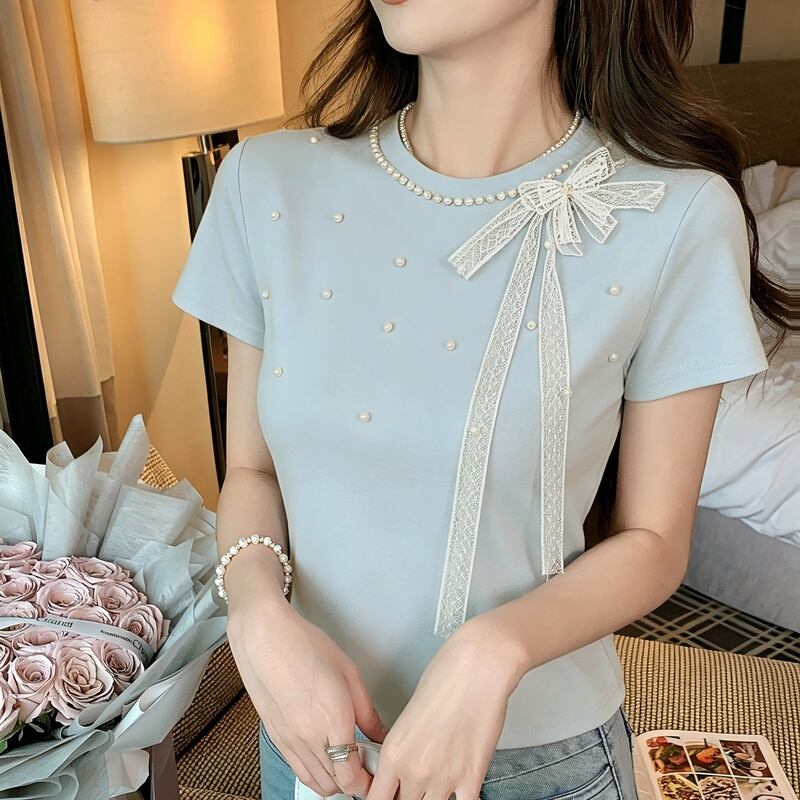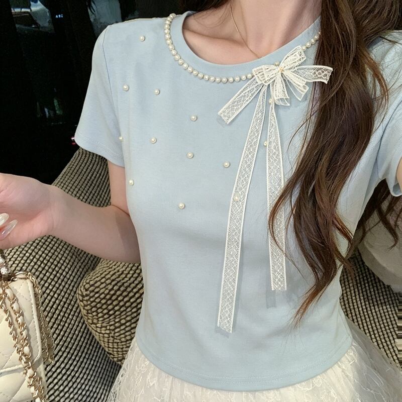 首元にあしらわれたパールと、繊細なレースリボンが顔周りを上品に彩るTシャツです。