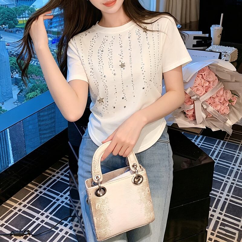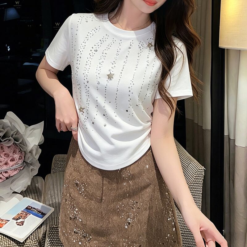胸元に輝く星とラインストーンのモチーフが、コーディネートに上品な華やかさをプラスする半袖Tシャツ。