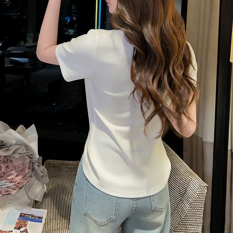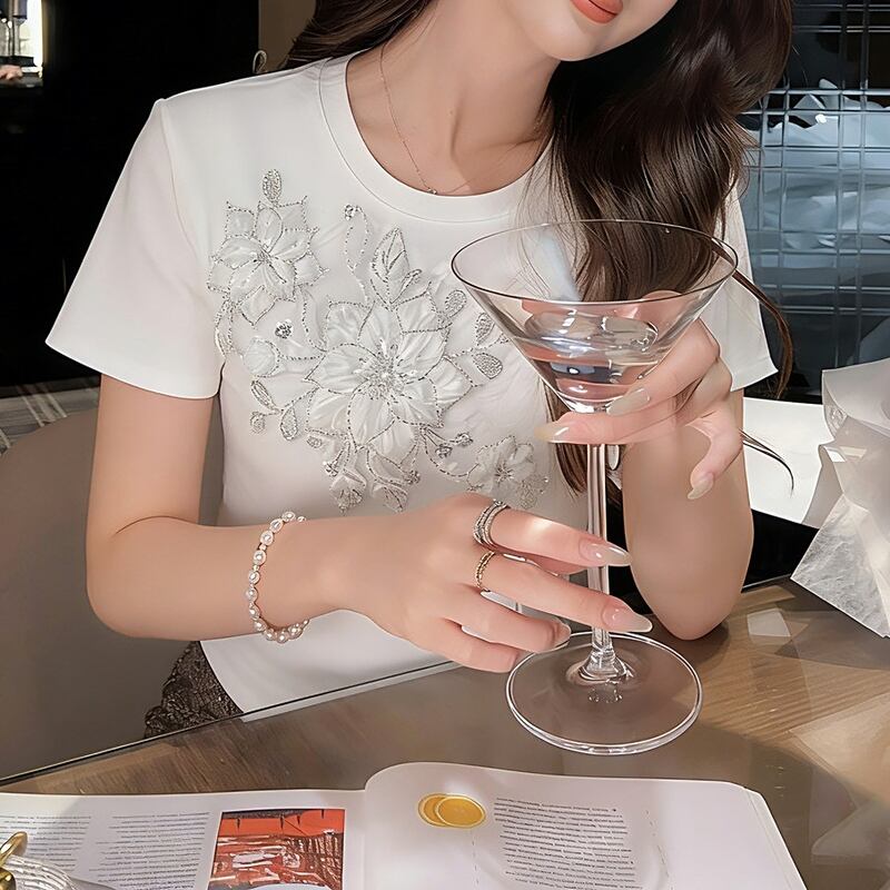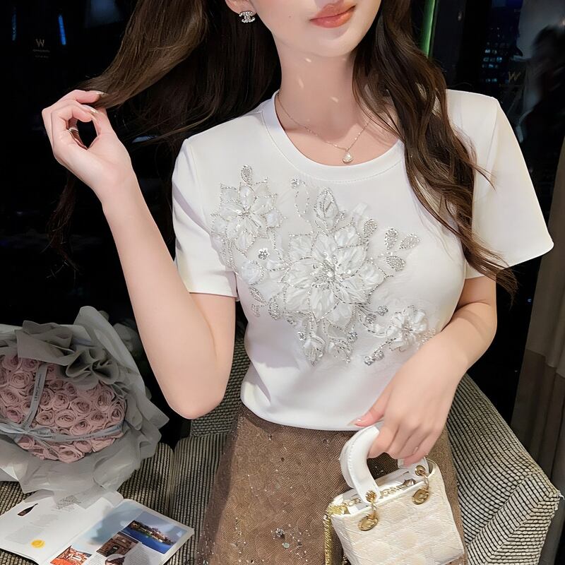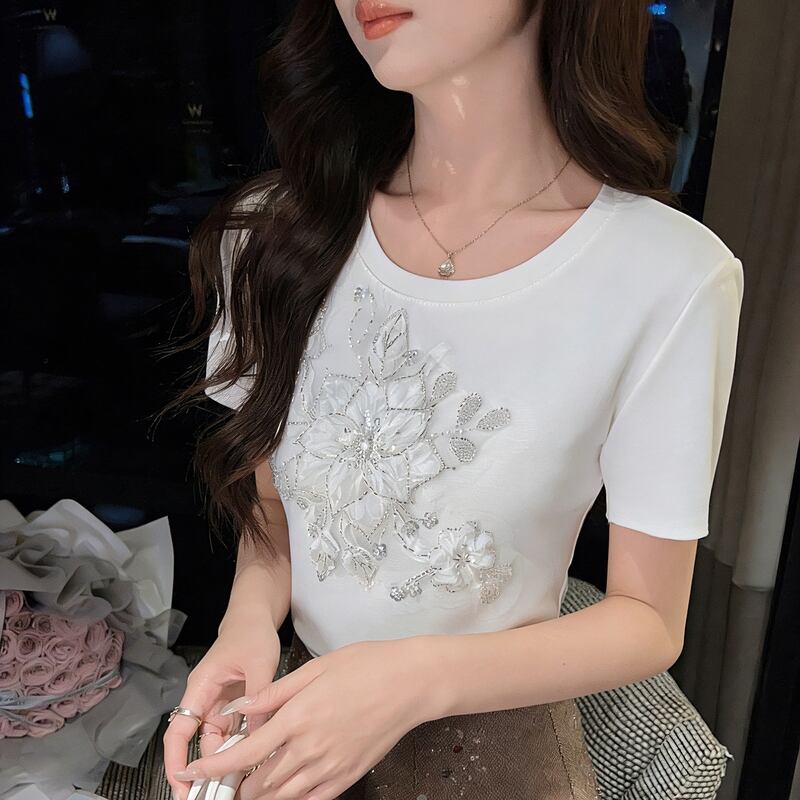 立体フラワー刺繍装飾Tシャツ 00485