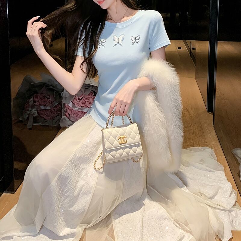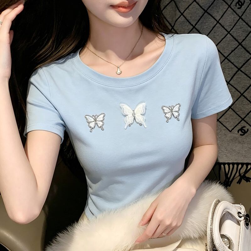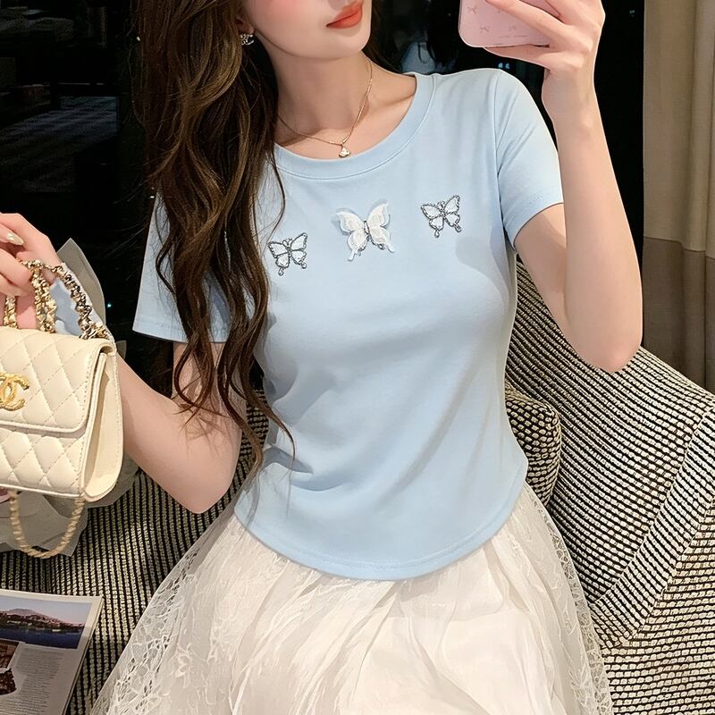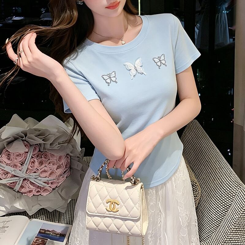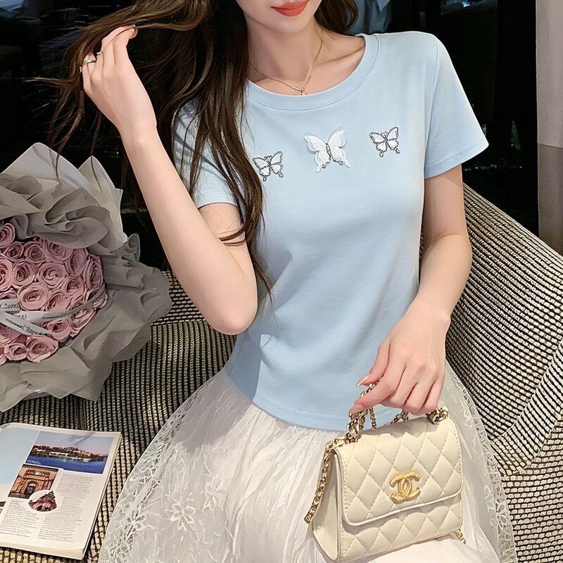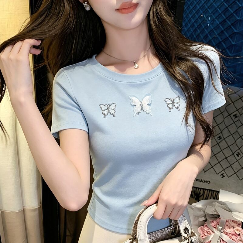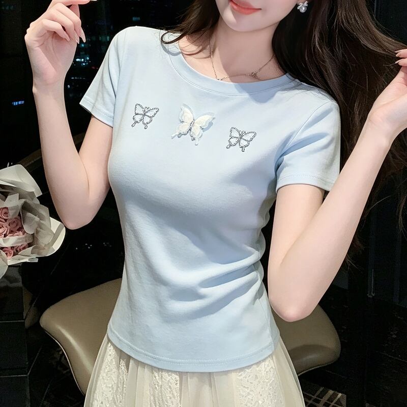 胸元にあしらわれた立体的な蝶のモチーフが、シンプルなTシャツにさりげない華やかさを添えます。