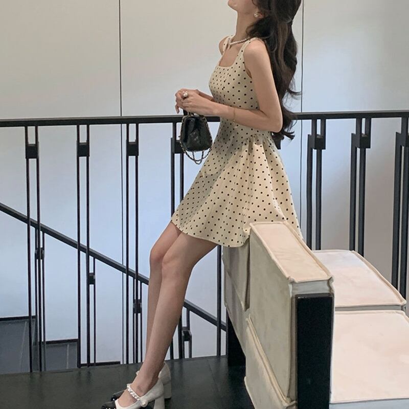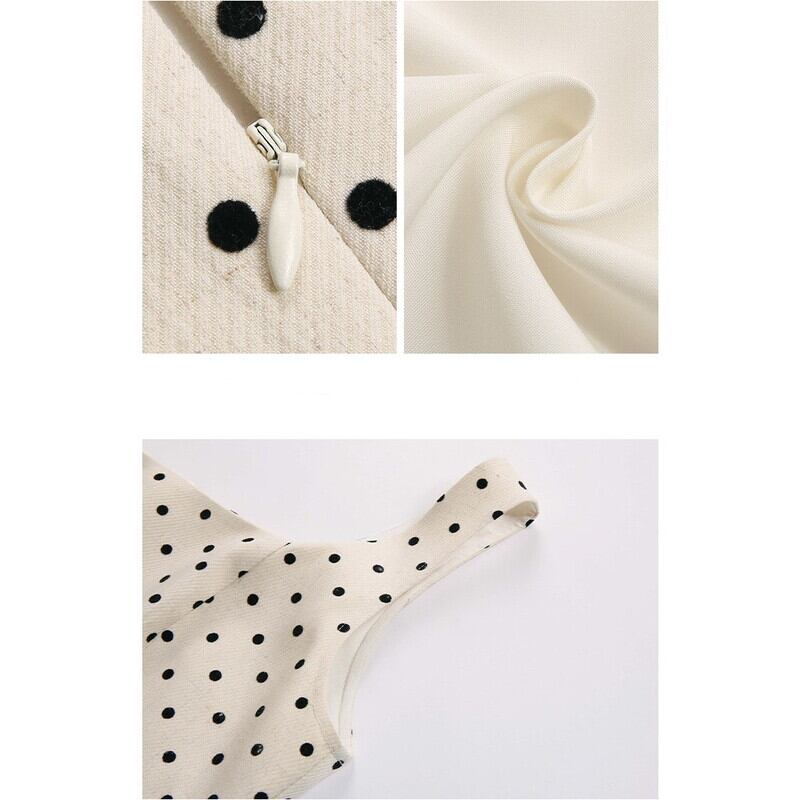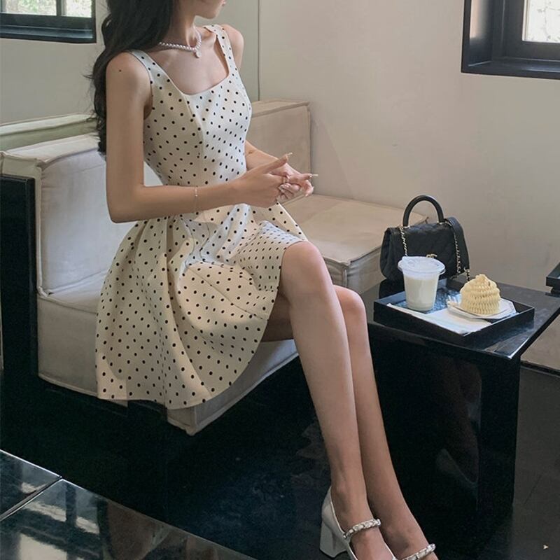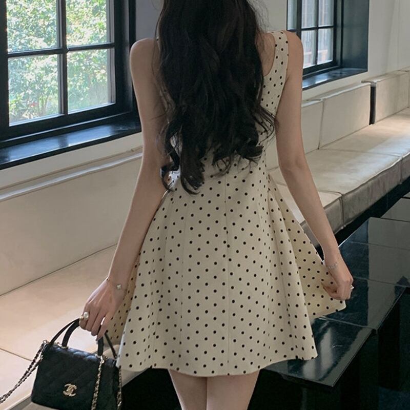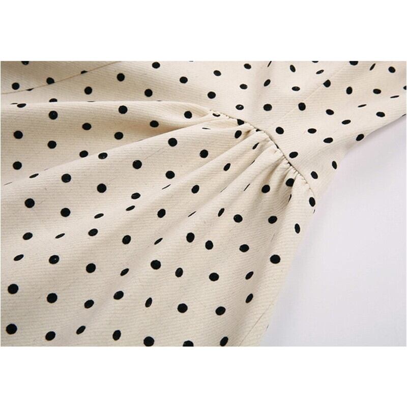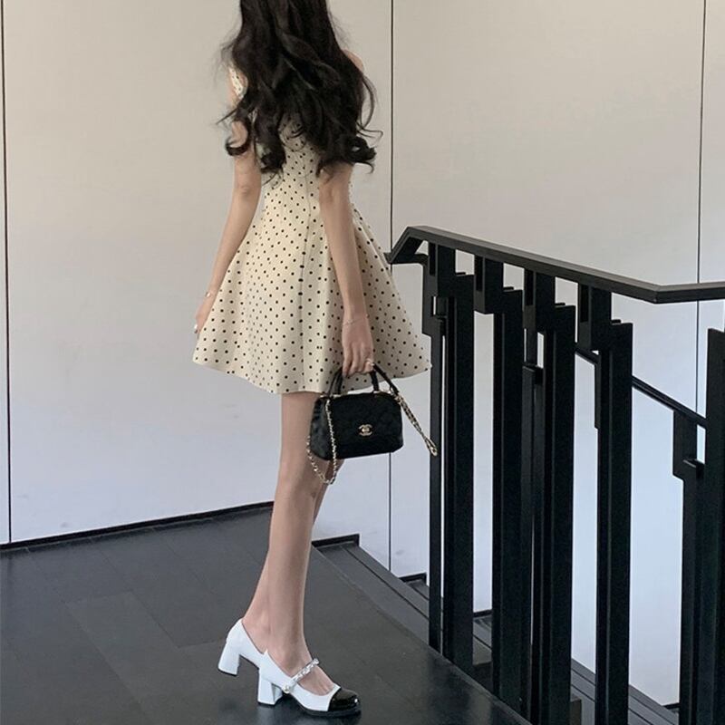 クラシカルなドット柄と、歩くたびに揺れるフレアシルエットが、女性らしさを引き立てます。