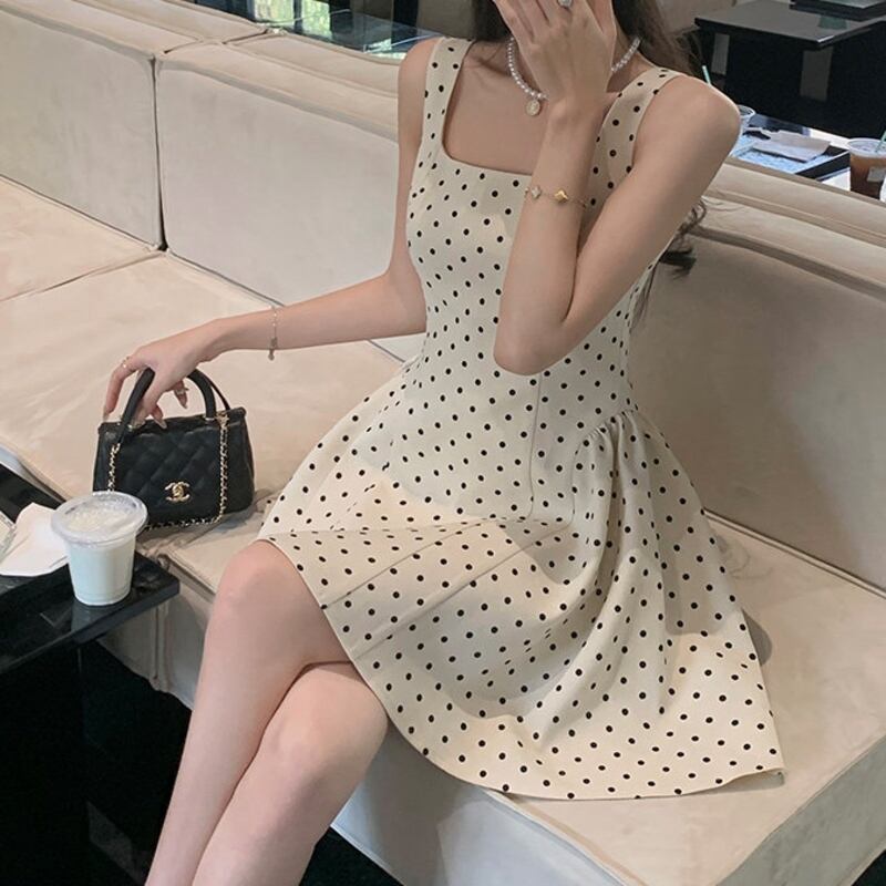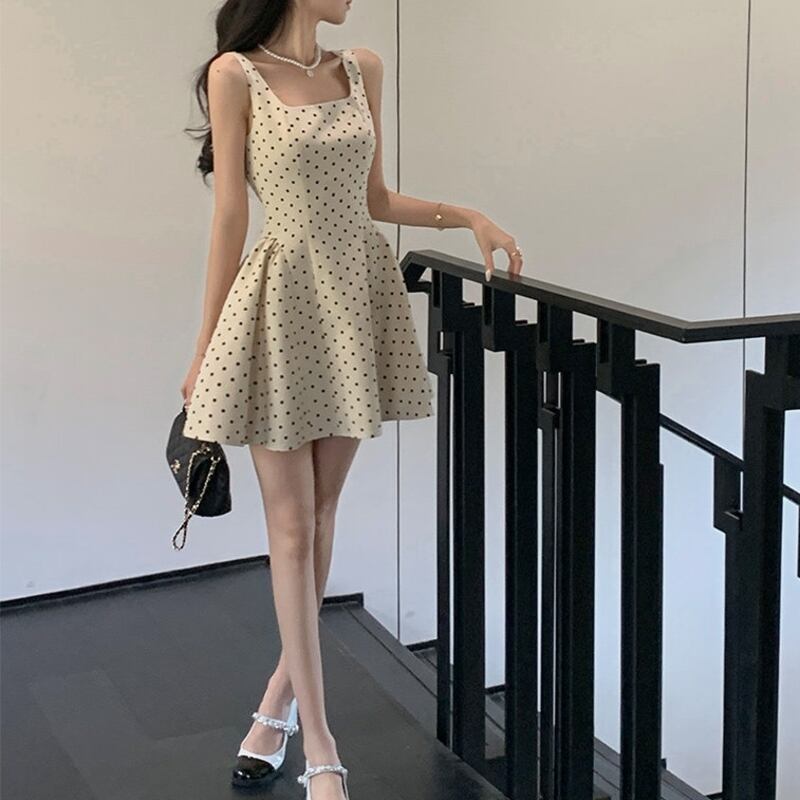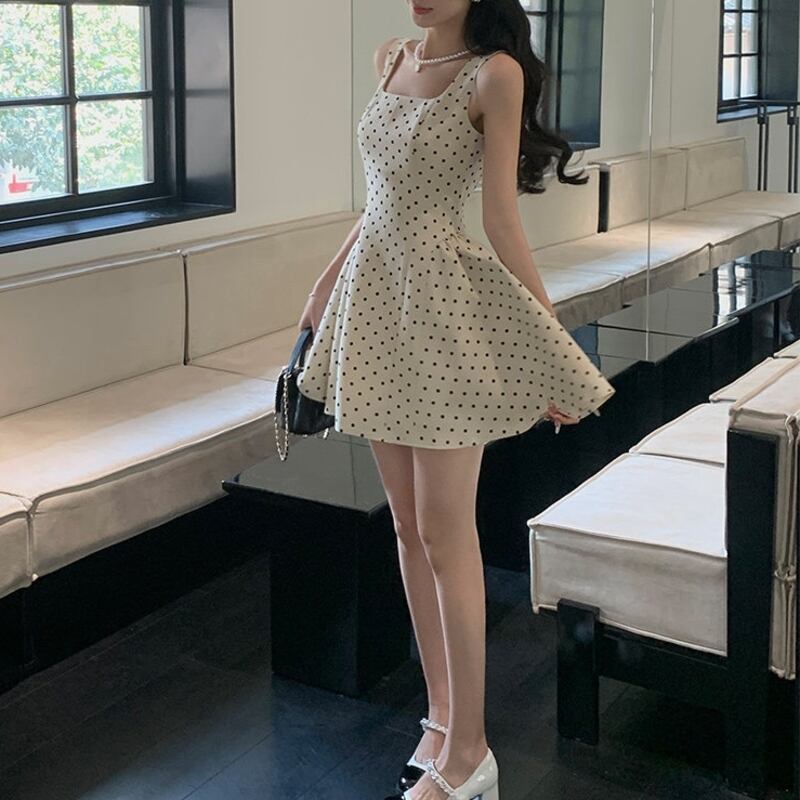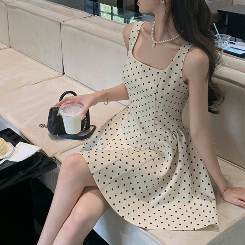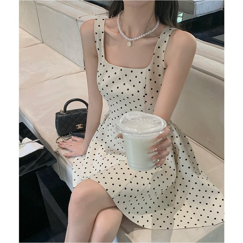 スクエアネックドット柄サイドギャザーワンピース 00480